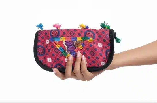 This beautifully handcrafted embroidered clutch purse showcases rich traditional artistry with intricate thread embroidery and bold geometric patterns. The vibrant colors and detailed craftsmanship make it a statement accessory that enhances both casual and festive outfits.