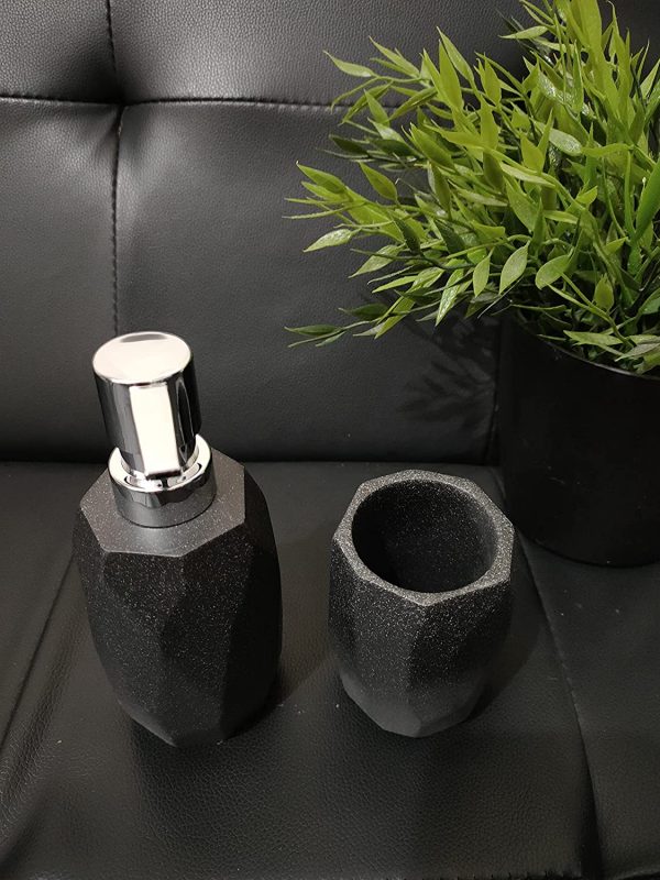 Sandstone Bathroom Accessories Set Soap Dispenser and Tumbler. Set of 2 pieces black Soap Dispenser and black Tumbler comes with its abstract-style body and shining black colour, This set looks like it has been carved from a block of pure onyx. Perfect for hand soap/lotions and ideal to store your toothbrushes and toothpaste. This dispenser set will bring a sense of lavish grandeur to your bathroom. you bathroom give look of the jewel-like sophistication.